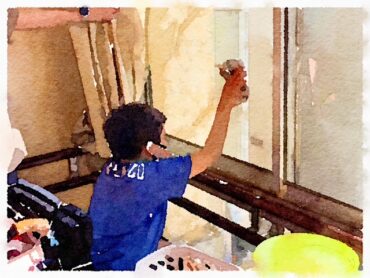 古新聞を使って、窓ガラス拭きを行っています。