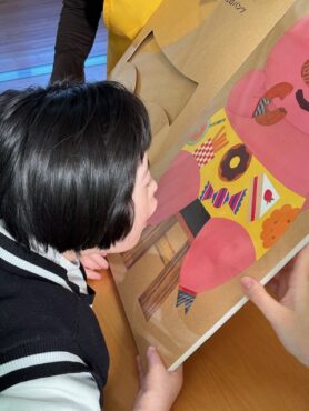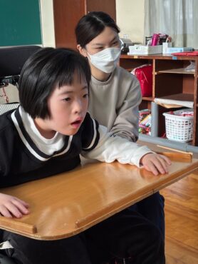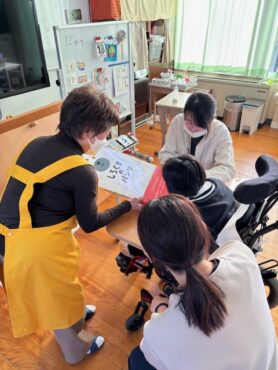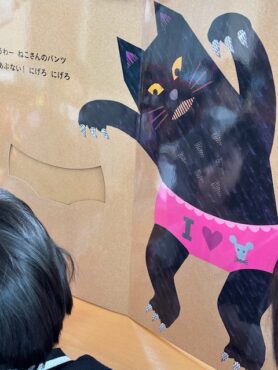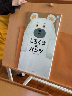 2025.12.22 絵本の読み聞かせ(12月) 小学部のある教室で絵本の読み聞かせです。 今日の絵本の1冊目は、「しろくまのパンツ」です。 主人公のしろくまが自分のパンツを探す内容です。 作中(さくちゅう)には様々なキャラクターが登場します。 前ページの「穴」から、次のページのキャラクターがはいているパンツの模様が見えます。 次々と登場するキャラクターに、 子供の視線(しせん)が釘付(くぎづ)けでした。