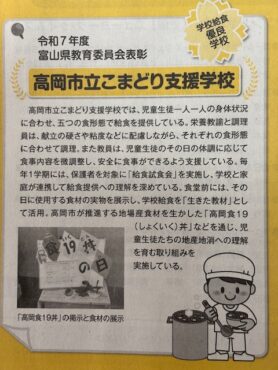 2026.1.30 NEW 全校 給食 学校給食優良学校(富山県教育委員会表彰) 本校が富山県教育委員会の「学校給食優良校」を受賞しました。表彰状と記念品(能作さんの時計)を頂きました。 1/23富山県庁での受賞でしたが、大雪が予想されて中止に。1/28高岡市教育長さんから授与いただきました。 食堂で子供たちに、そしてPTA(保護者)の方々にも、受賞の報告をしました。 R7.1.24(土)の北日本新聞に掲載されました。 今後とも、栄養教諭、調理員、教員がチームで子供たちに美味しい給食を、安全に提供していきます。