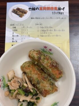 本日のスペシャルメニューが竹輪(ちくわ)の「高岡銅器(どうき)風(ふう)」揚げです。材料や作り方も書いてありました。