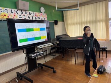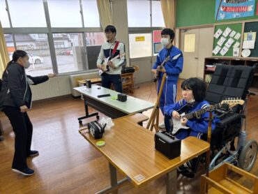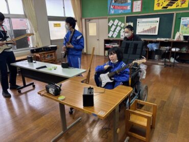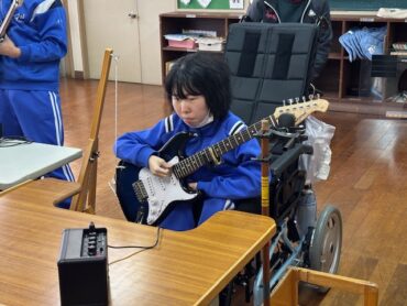 2026.3.2 NEW 中学部 音楽(器楽の合奏) 生徒が音楽室に集まってきました。すでにエレキギターがセッティングされています。 今日は曲(シルエット)に合わせて、エレキギターで合奏します。 3本のギターはそれぞれが担当するコード(和音)が鳴るように調整されています。 画面でコードが色分けされています。先生の指揮に合わせて、担当するコードを演奏します。 この日が初めての合奏でしたが、なかなか様になっていると感じました。来週も頑張りましょう。